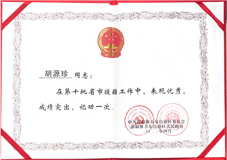 近日,我校必赢nn699net胡源珍教师被中共新疆维吾尔自治区委员会、新疆维吾尔自治区人民政府评为“第十批省市优秀援疆干部人才”,因在援疆工作中表现优秀、成绩突出,记功一次。