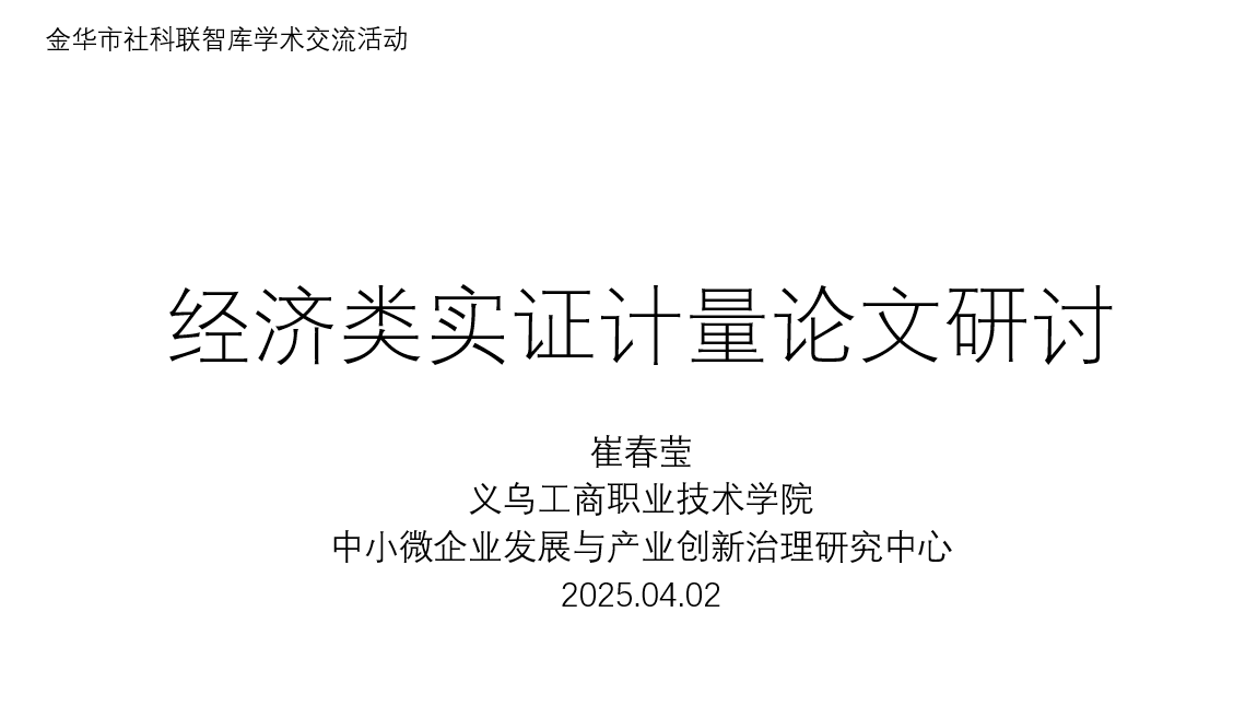 为进一步提升青年教师和研究者的实证研究能力,推动高水平学术论文的撰写与发表,4月2日,由我校金华市社科联智库——中小微企业发展与产业创新治理研究中心举办的的“经济类实证计量论文研讨”学术交流活动在宾王长廊212举行,由智库成员崔春莹教授担任主讲人。