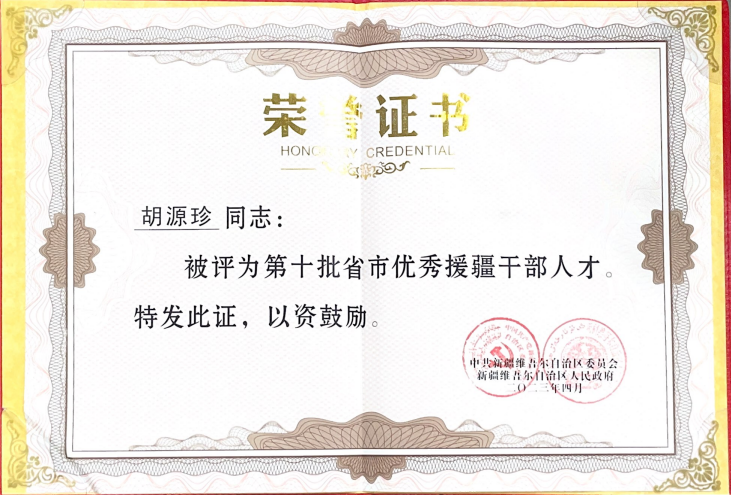 近日,我校必赢nn699net胡源珍教师被中共新疆维吾尔自治区委员会、新疆维吾尔自治区人民政府评为“第十批省市优秀援疆干部人才”,因在援疆工作中表现优秀、成绩突出,记功一次。