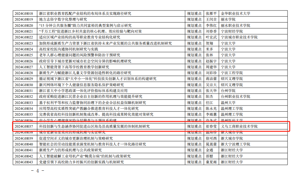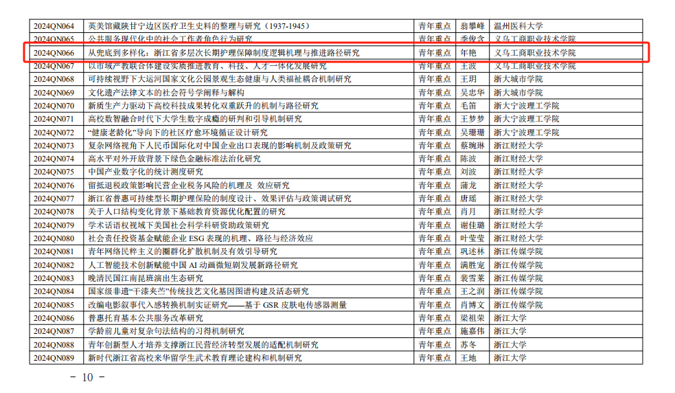 12月23日,浙江省教育厅公布了《浙江省教育厅办公室关于公布2023-2024年度浙江省高校重大人文社科攻关计划项目的通知》(浙教办函〔2024〕232号),我院共有2个项目成功入选,实现了该项目立项新突破。其中,崔春莹教授主持的课题获规划重点项目立项,年艳副教授主持的课题获青年重点项目立项。