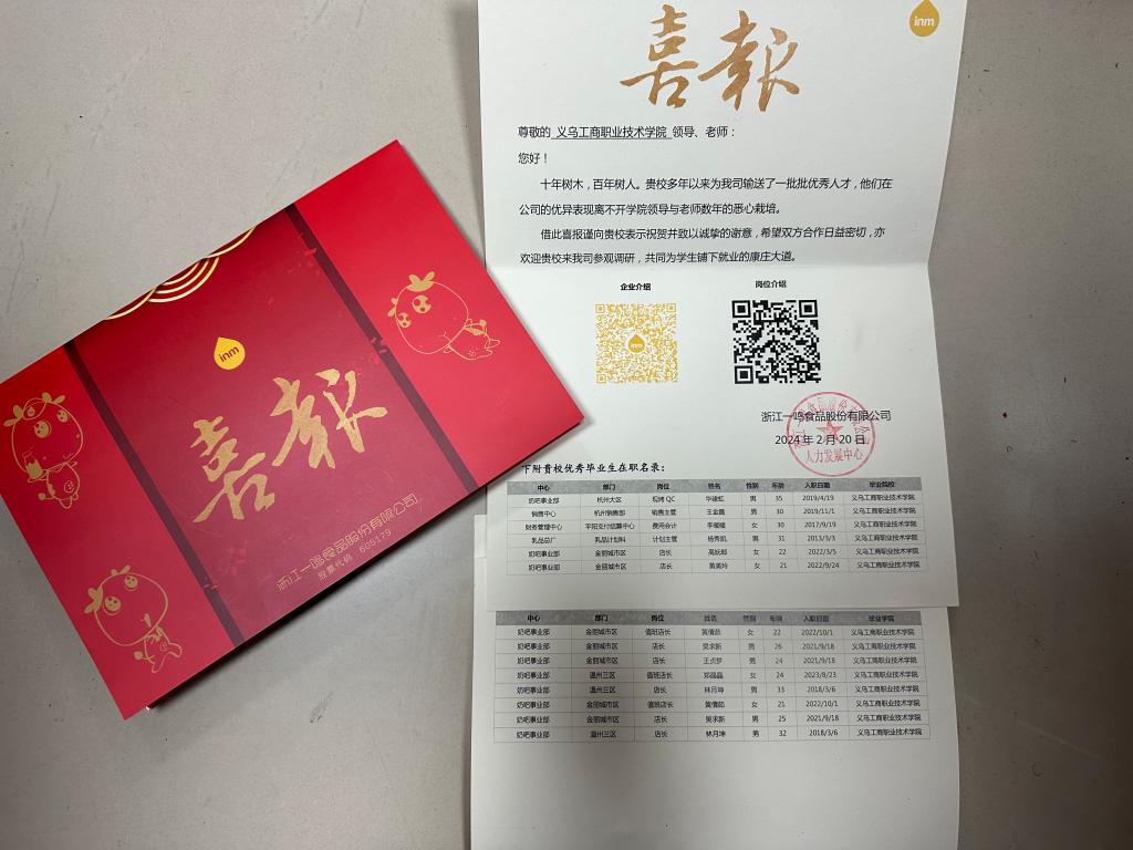 近日,必赢nn699net收到一封来自浙江一鸣食品股份有限公司的喜报。信中高度认可吴求新等13位毕业生在岗的优异表现,并向学校为公司发展输送一批批优秀人才致以诚挚的谢意,期待未来能与学校更加紧密合作。